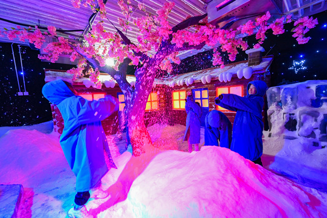 入伏首日,人们来到山东省青州古城景区室内冰雪世界,赏冰雕、打雪仗、滑雪圈,乐享清凉。新华社发(王继林摄)