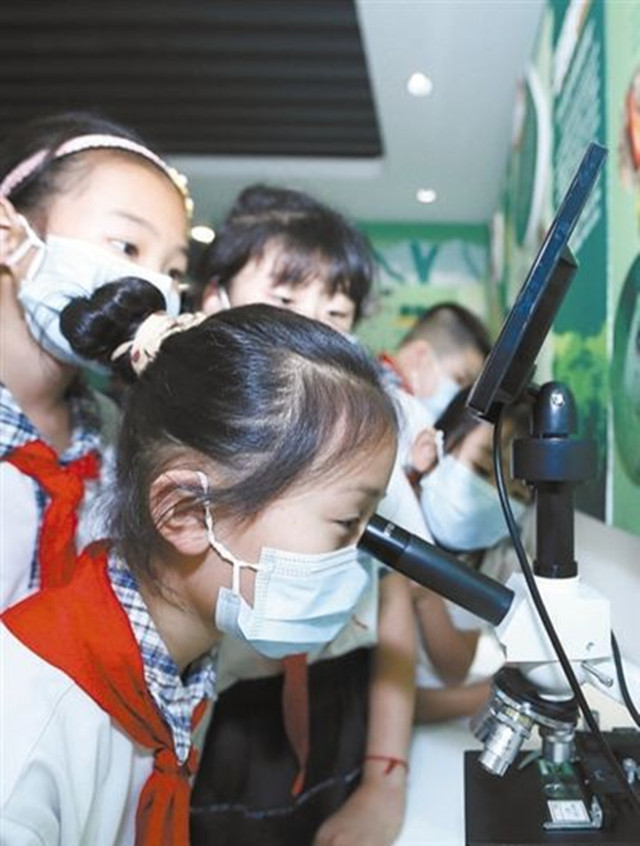 日前,青岛市莲花山小学组织学生来到中国农科院特种作物研究中心青岛试验基地,开展“走进科普课堂 探索生物奥秘”主题教育活动。孩子们参观了田园昆虫科普馆,聆听科普知识,参与趣味实验。这些活动有助于激发他们对科学的兴趣,提高对保护生物多样性的认识。图为小学生在观察生物样本。梁孝鹏摄 (人民日报7月11日19版)
