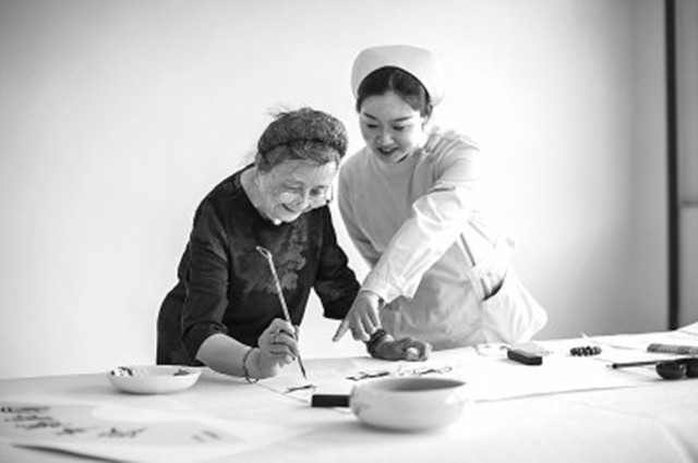 目前,泰安60岁以上的老人占比22.1%。为满足老年人医疗和养老需求,当地积极推动医养结合服务,成立泰山医养中心。该中心依托泰安市中心医院的医疗资源,实行健康管理、医疗、康复、养老照护于一体的医养结合服务模式,为老年人提供高质量的医养服务。图为医养中心工作人员在陪伴老人。段金磊摄(光明日报7月15日3版)