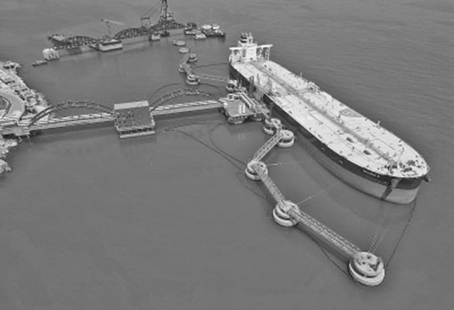 日前,山东港口烟台港原油管道复线(干线)正式启输。该项目从烟台港西港区出发,直达东营输油站,全长370余公里。该管道与原有的烟台至淄博长输管道形成“双管齐下”的新布局,输送能力由原来的每年2000万吨提升至4000万吨。图为7月8日,在烟台港西港区30万吨级原油码头,一艘油轮通过原油管道卸油。唐克摄(光明日报7月11日10版)