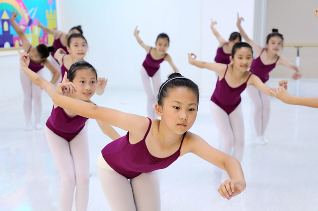7月12日,山东省东营市东营区文汇街道一舞蹈培训学校教室里,学生在练习舞蹈动作。