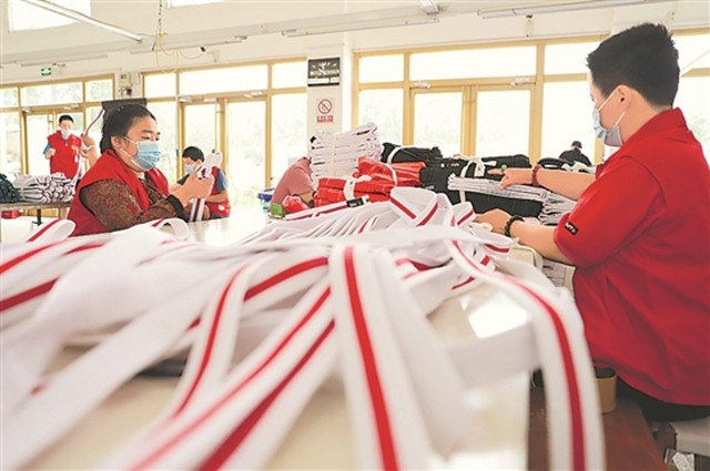 7月11日,青岛西海岸新区康源残疾人辅助性就业中心内,残疾人职工在工作台上忙碌。 西海岸新区进一步推进残疾人辅助性就业,通过对残疾人进行培训,让残疾人自食其力,既提高了残疾人的自信心,又减轻了其家庭负担。本报通讯员 王培珂摄(工人日报7月13日2版)