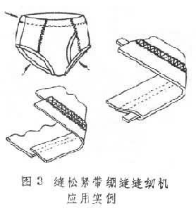 ②缝松紧带绷缝缝纫机:每分钟约缝制5000个线迹。机体为平台式,采用油泵自动润滑,还装有差动滚轮进给机构和可调节压辊。图3为其应用实例。