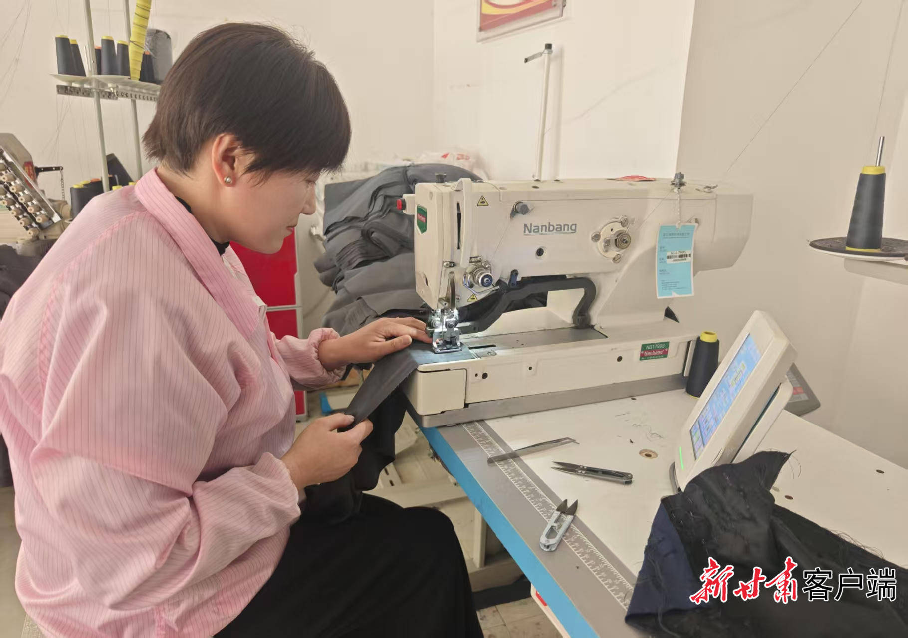 郑双燕(左)在车间指导员工缝纫。本文图片均由新甘肃·甘肃日报记者 田丽媛摄